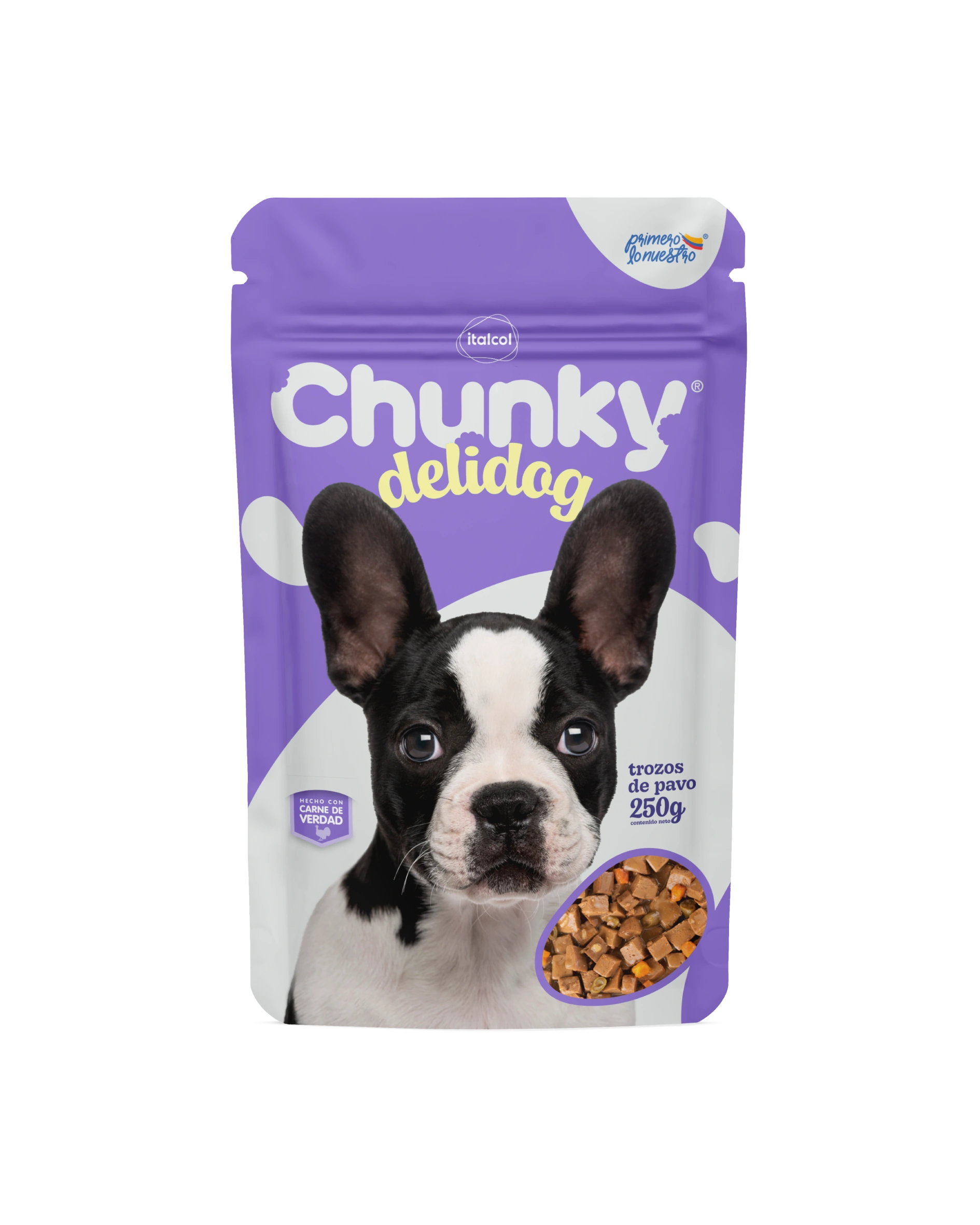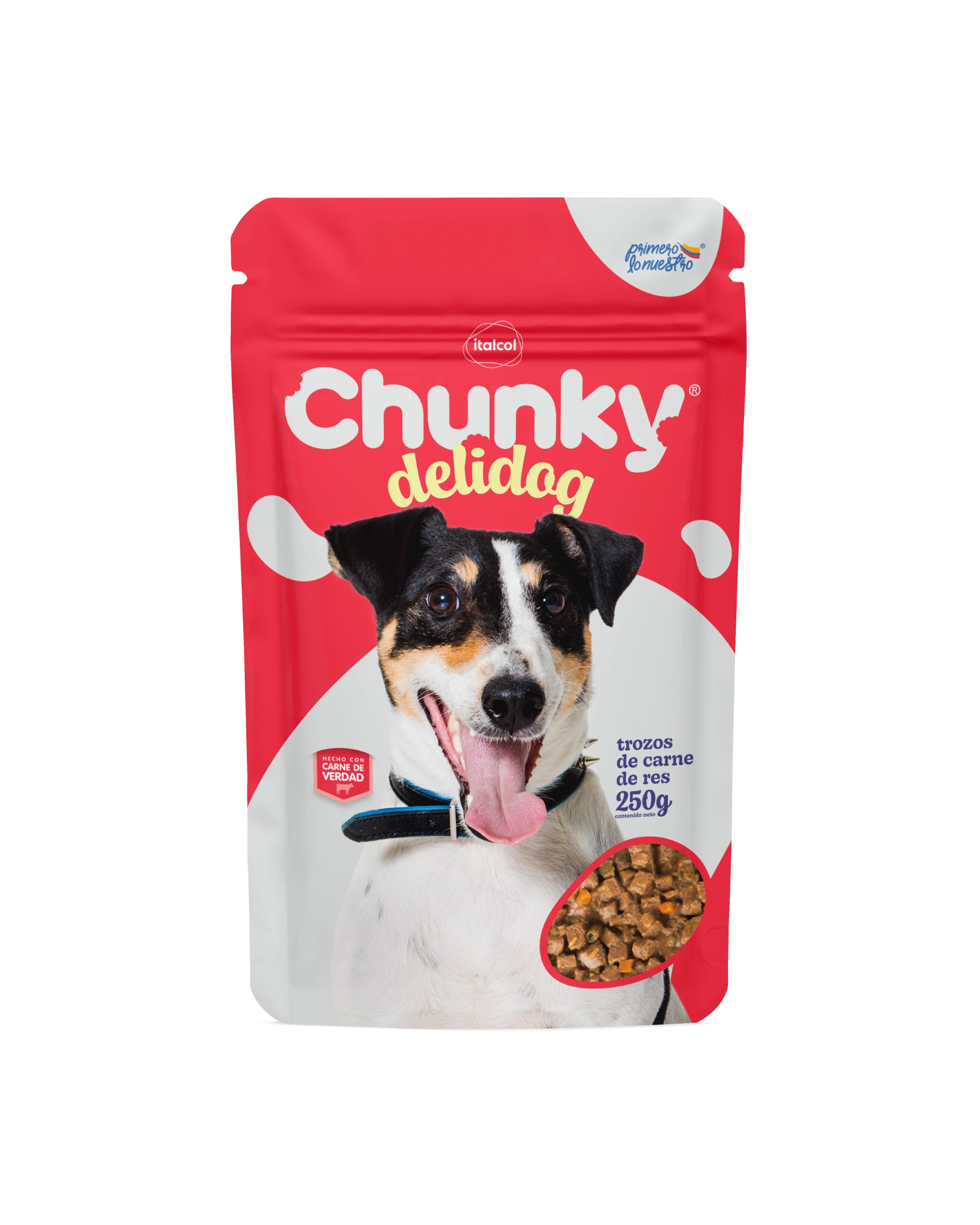 ITALCOL CHUNKY Delidog Deliciosos trozos en salsa elaborados para brindar una alimentación húmeda sabrosa y nutritiva para tu perro.
