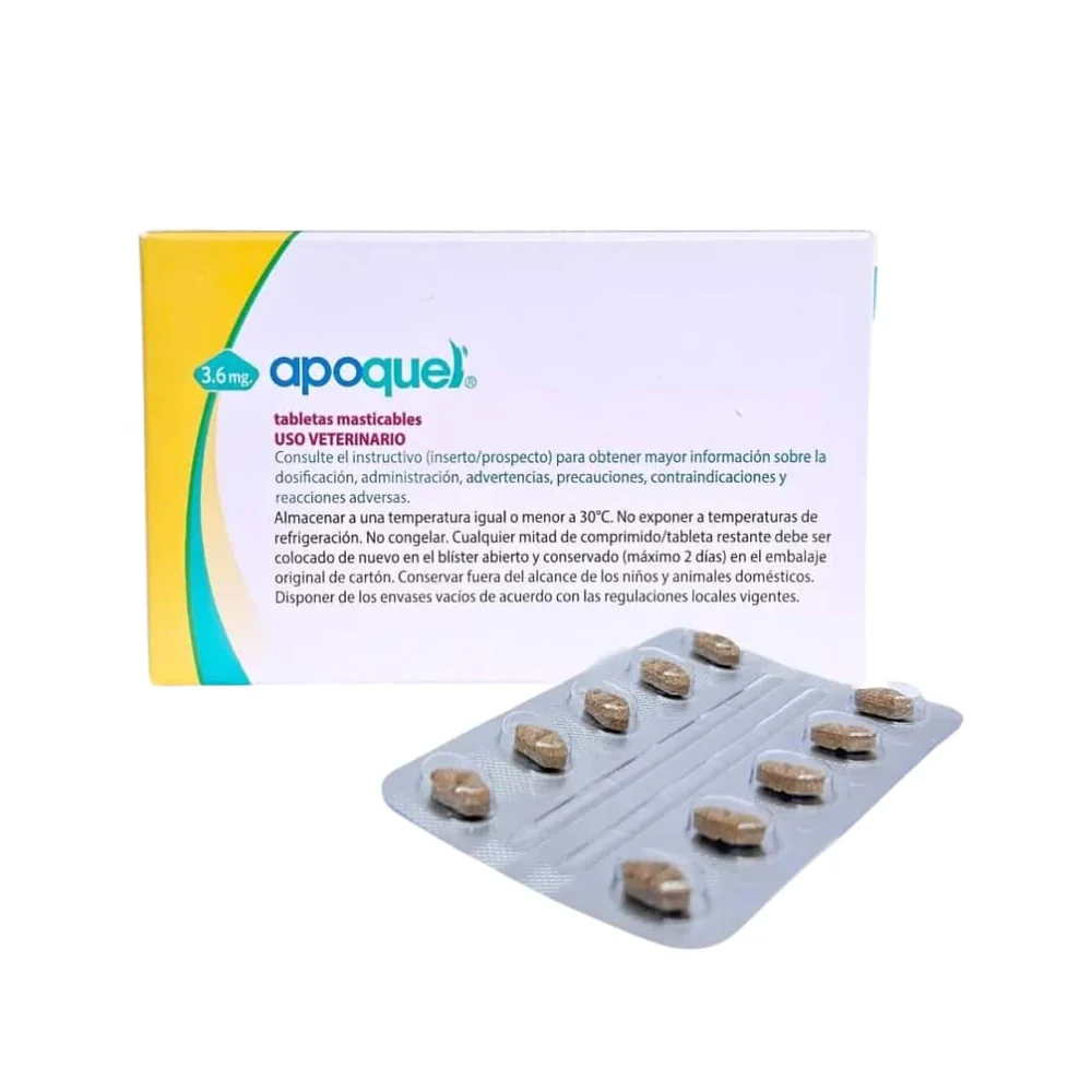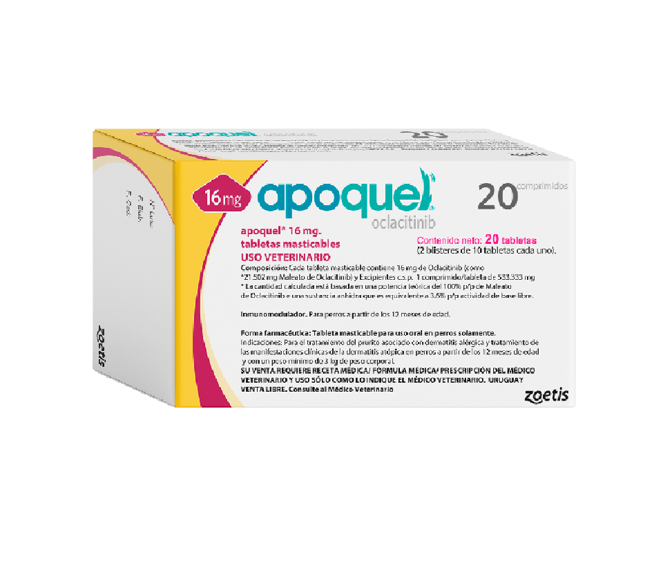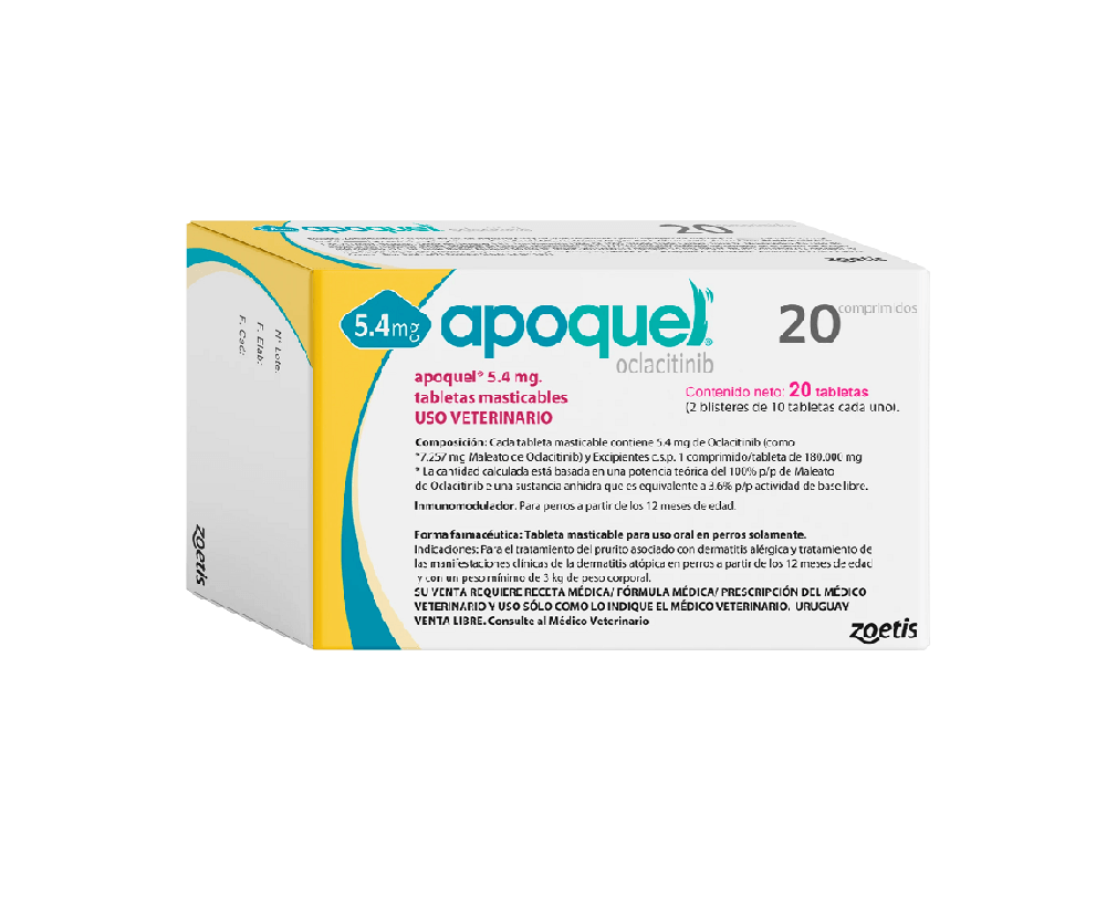 ZOETIS APOQUEL Tabletas masticables sabor Higado de Cerdo Alivio en las primeras 4 horas. Control del prurito en las primeras 24 horas sin lo eventos adversos asociados a los glucocorticoides. COMPONENTES: Maleato de Oclacitinib USOS: Para el tratamiento del prurito de origen alérgico asociado con dermatitis alérgica y para el tratamiento de las manifestaciones clínicas de la dermatitis atópica en perros mayores de 1 año y con un peso mínimo de 3 Kg.