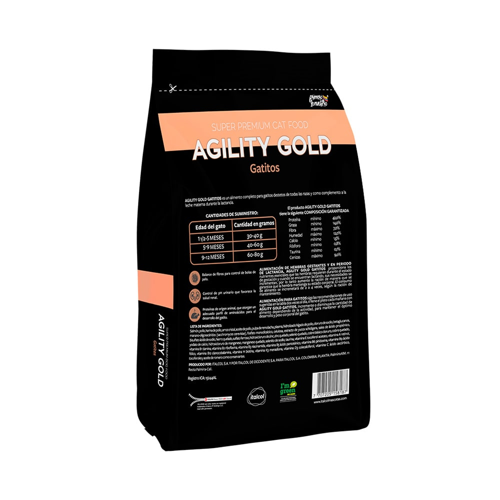 ITALCOL AGILITY GOLD Gatitos Alimento súper premium para gatitos, elaborado con nutrientes esenciales, proteínas de alta calidad, vitaminas y minerales que favorecen un crecimiento saludable y el desarrollo óptimo durante sus primeras etapas de vida. Revisa la imagen para ver tabla nutricional y componentes completos.