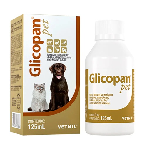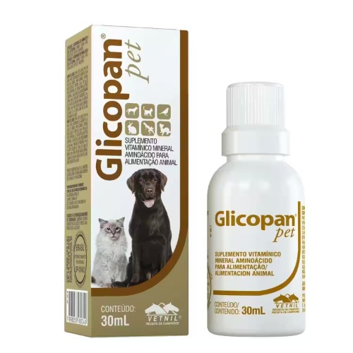 VETNIL GLICOPAN PET Suspensión Respuesta rápida para animales en condición nutricional inadecuada, porque combina aminoácidos, vitaminas del complejo B y glucosa. COMPONENTES: VITAMINAS: Vitamina B1, vitamina B6, vitamina B12, Pantotenato de calcio, nicotinamida, AMINOACIDOS: alanina, ácido aspártico, ácido glutámico, arginina, cisteína, glicina, Histidina, isoleucina, leucina, lisina, metionina, fenilalanina, prolina, serina, tiroxina, treonina, triptófano y valina, ENERGIA Y OTROS: glucosa beta Inna Colina, L.-carnitina glicerina USOS: Suplementación de aminoácidos y vitaminas del Complejo B para caninos, felinos, aves, mustélidos, reptiles y roedores. Auxilia en la mejora del estado general y en casos de animales con estado nutricional inadecuado. Auxilia en el estímulo del apetito y es energético. Indicado en el preparo de animales para exposición y animales en entrenamiento