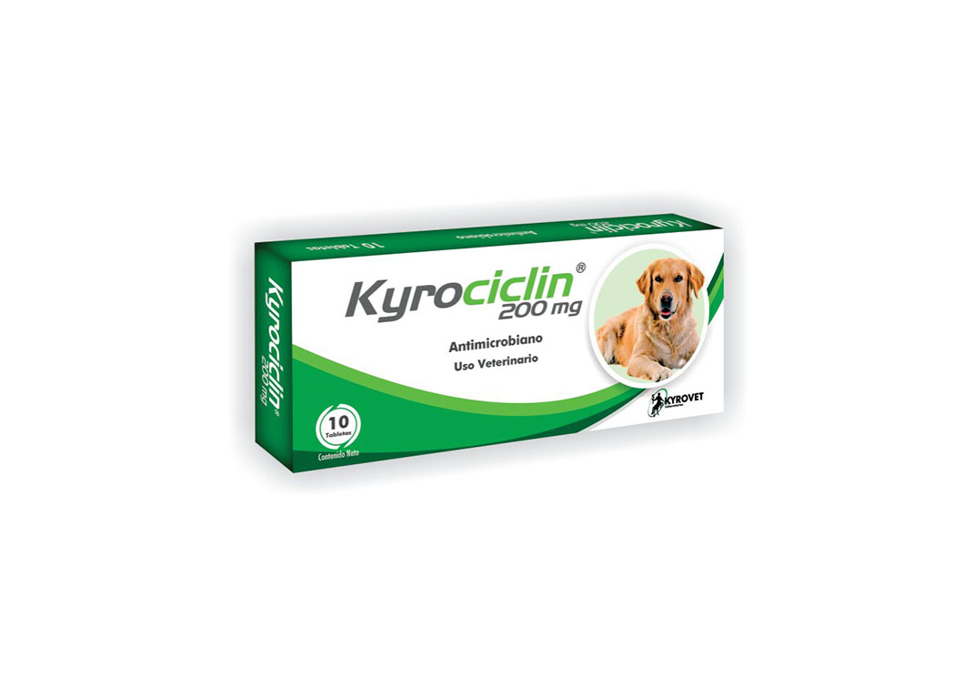 KYROVET KYROCICLIN tabletas Tetraciclina, antibiótico con usos bactericidas, primera elección para Hemoparásitos. COMPONENTES: Doxicilina Hiclato 100mg USOS: En perros y gatos como primera opcion para patologias como: Ehrlichia canis y Mycoplasma Haemofelis (haomobartonella) Como segunda eleccion para enfermedades de patogenos como: Corynebacterium spp, Streptococcus spp, Bordetella bronchiseptica, Bordelia burdogfer, Brucella canis, Campilobacter jejuni, Haemophilus spp., Leptospira spp., Pasteurella multocida, Chlamydia spp., Mycoplasma spp., Fusobacterium spp., Staphylococcus spp., y Toxoplasma gondii.
