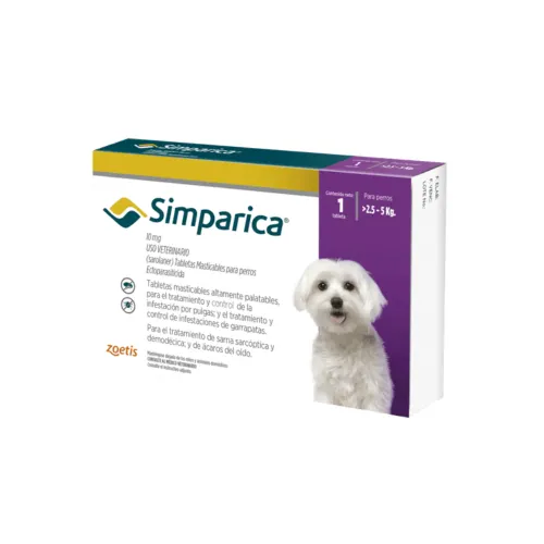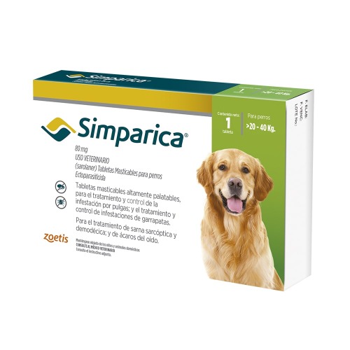 ZOETIS Simparica tabletas masticables Antiparasitario externo oral de acción rápida en tabletas masticables para perros. COMPOSICION: Sarolaner USOS: Elimina pulgas y garrapatas durante al menos 35 días (5 semanas), comenzando a eliminar pulgas en 3 horas. Es seguro para cachorros desde las 8 semanas.