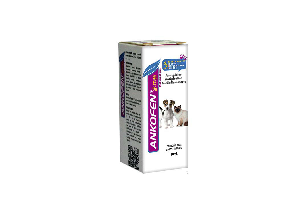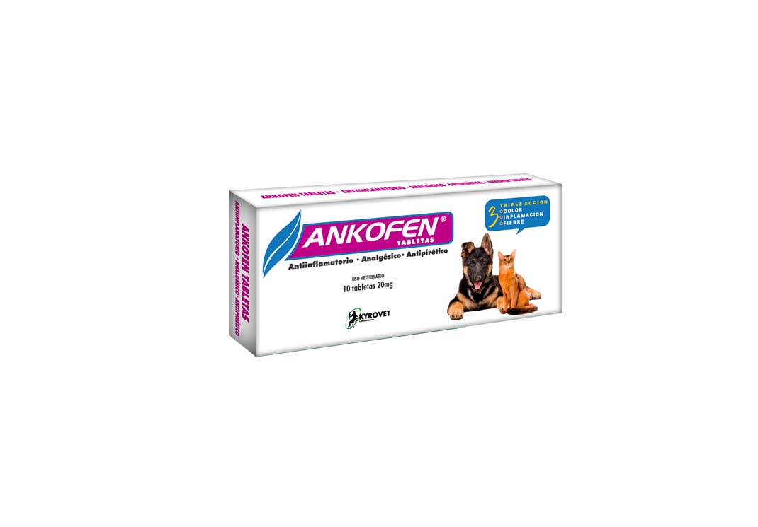 KYROVET Ankofen Antiinflamatorio, Analgesico y Antipiretico no esteroide para gatos y perros. COMPONENTES: Ketoprofeno 10 mg USOS: Estados dolorosos e inflamatorios de origen no infeccioso de los sistemas osteoarticular y musculo esquelético, artrosis, traumatismos, luxaciones, esguinces , dolor posquirúrgico, artritis y edemas.
