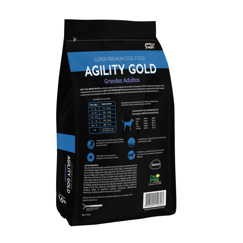 ITALCOL AGILITY GOLD Grandes Adultos Alimento súper premium para perros y gatos, fabricada en Colombia. Se destaca por ser un concentrado libre de granos (grain-free) que utiliza pollo y salmón como fuentes de proteína, enriquecido con prebióticos, probióticos, y omegas 3 y 6 para mejorar la digestión y el pelaje. Revisa la tabla nutricional y los ingredientes completos en la imagen.