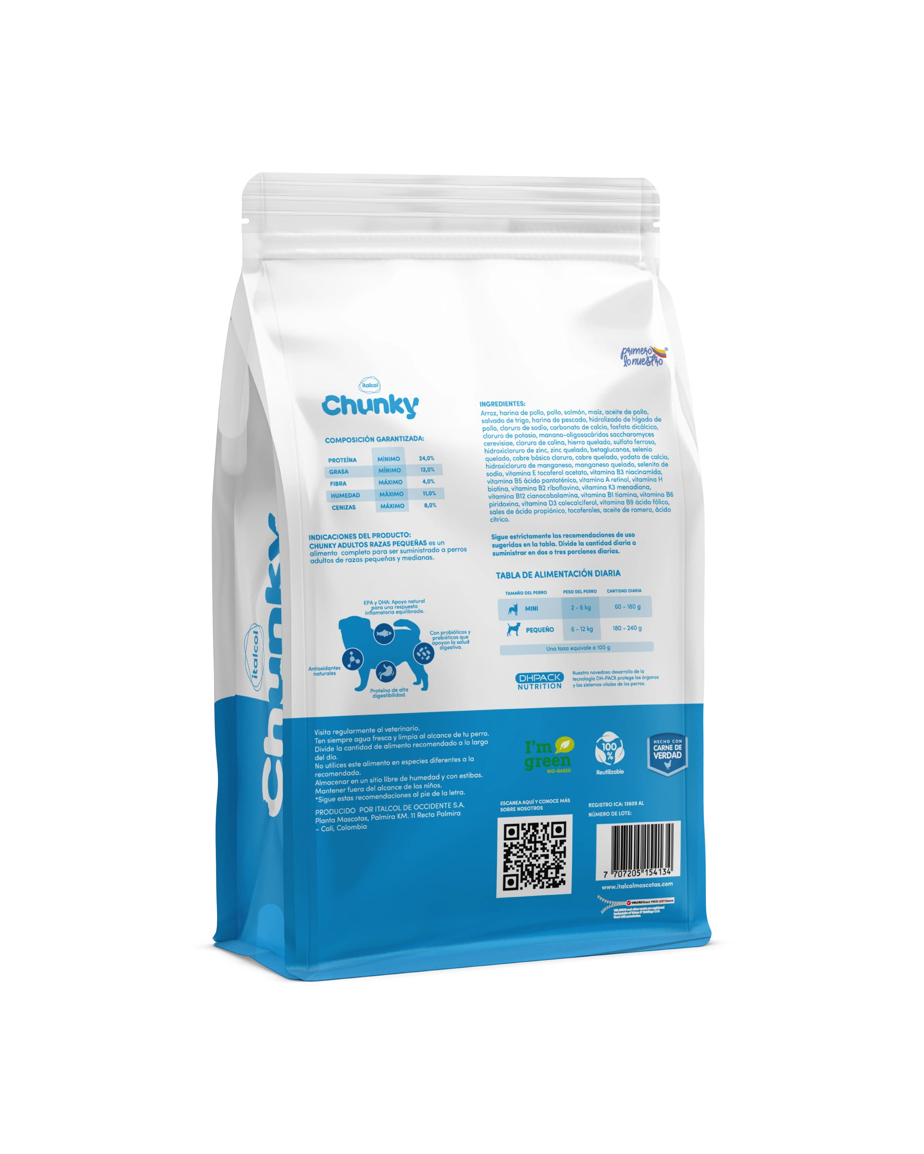 ITALCOL CHUNKY adulto raza pequeña pollo Alimento para perros de razas pequeñas, contiene DHA y EPA para piel y pelo saludable, con probióticos y prebióticos que apoyan la salud digestiva, proteína de alta digestibilidad, antioxidantes naturales.